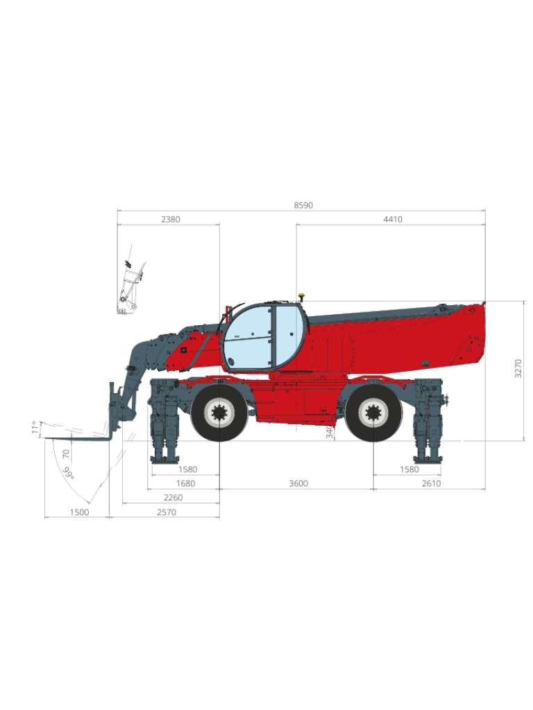 The 13.26 is highly sophisticated, as it can be used as a telehandler with fork attachments, a rough-terrain crane with a winch, and a work lift with a basket attachment, all by simply changing the attachment. Through the RFID system, the RTH 13.26 recognizes the attachment and automatically sets the relevant safety devices and load chart.
